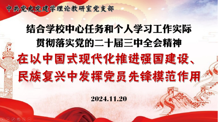 11月24日至26日,中共党史党建学理论教研室党支部于人文楼917组织开展学习党的二十届三中全会精神集中培训,包含集体学习、线上报告与心得交流三个部分。通过学习,支部党员均深感重任在肩、使命远大,展望未来、倍觉激励,一致表示不忘初心、坚定信心、团结一心、凝心铸魂,坚持学思践悟、强化党性锤炼、提升党性修养、增强党性意识、始终对党忠诚,在个人具体工作岗位上为实现中华民族伟大复兴奉献全部力量。