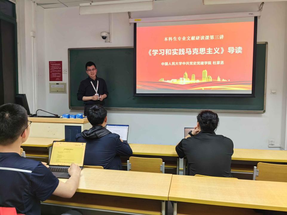 杜家丞老师首先从文献的创作背景与问题意识、文本的结构逻辑和文献的理论意蕴三个方面进行讲授。他指出,中国共产党以马克思列宁主义作为自己的行动指南,怎样正确认识和评价马克思及其历史地位,怎样正确坚持和发展马克思主义,是关系到中国共产党思想根基的重大命题。在马克思诞辰200周年之际,这篇文献集中论述了中国共产党对马克思主义的认识和评价。文献高度评价和缅怀了马克思的伟大人格和历史功绩,总结概括了马克思主义的思想精髓与历史影响,宣示了中国共产党人对马克思主义科学真理的坚定信念,号召全体中国共产党人不断深入学习和实践马克思主义。他强调,同学们在学习文献时,还要从文本出发进一步拓展学习,思考文献中提及的关于共产主义理想、社会发展阶段、生产力和生产关系等理论问题,努力开辟学习和研究马克思主义的新境界。