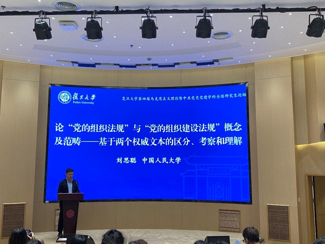 发布日期:2023-10-252023年10月14日至16日,复旦大学第四届马克思主义理论暨中共党史党建学科全国研究生论坛在上海举办。我院2023级党的建设(党内法规)专业博士研究生刘思聪向论坛提交的论文《论“党的组织法规”与“党的组织建设法规”概念及范畴——基于两个权威文本的区分、考察和理解》获评特等奖,并获邀在会议主论坛上就该论文作学术报告。