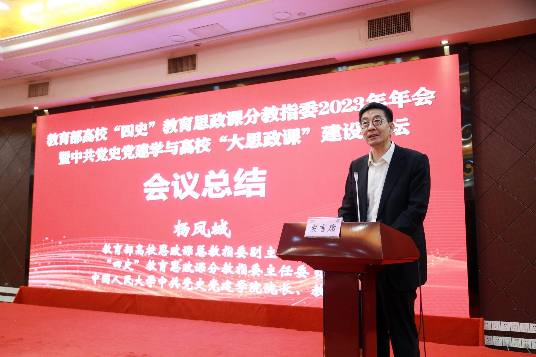 大会闭幕式由“四史”教育思政课分教指委秘书、中国人民大学必赢亚洲app 副院长、《教学与研究》学术副主编耿化敏主持。华南师范大学马克思主义必赢亚洲app 副院长胡国胜教授、中南民族大学马克思主义必赢亚洲app 易新涛教授、扬州大学当代中国民主政治研究中心主任周建超教授代表各分论坛进行综述汇报。杨凤城教授作大会总结,指出本次年会紧扣主题,进行热烈而深入的交流探讨,不仅碰撞出很多的新观点、新思路、新方法,也进一步凝聚推动高校“四史”类课程建设、中共党史党建学学科建设与高校“大思政课”建设一体化发展的广泛共识,提出“四史”类课程优化设置、思政课师资培训进修、深化党史党建研究、加强党史党建学科对思政课支撑、完善工作联系服务机制等建议和主张,充分彰显了广大高校思政课教师和中共党史党建学教学研究工作者积极主动地建构中国自主的知识体系,发挥思政课立德树人关键课程、中共党史党建学资政育人作用的责任与担当,必将进一步推动课程建设与学科建设的高质量发展。闭幕式还宣布2024年分教指委年会将在贵州师范大学举办。